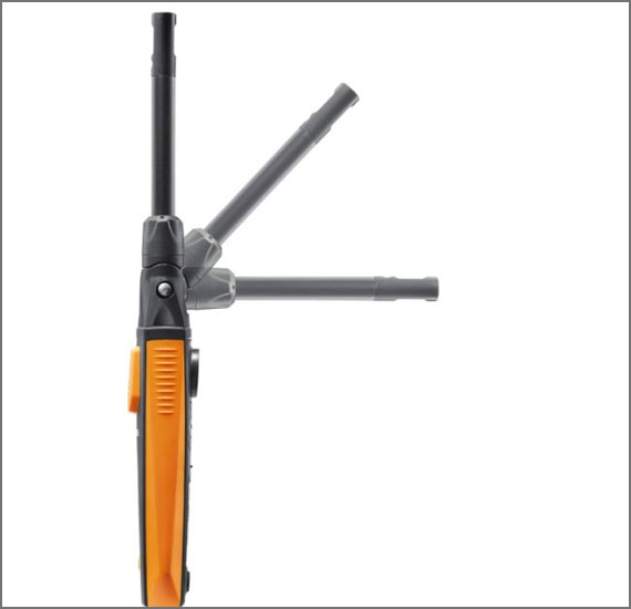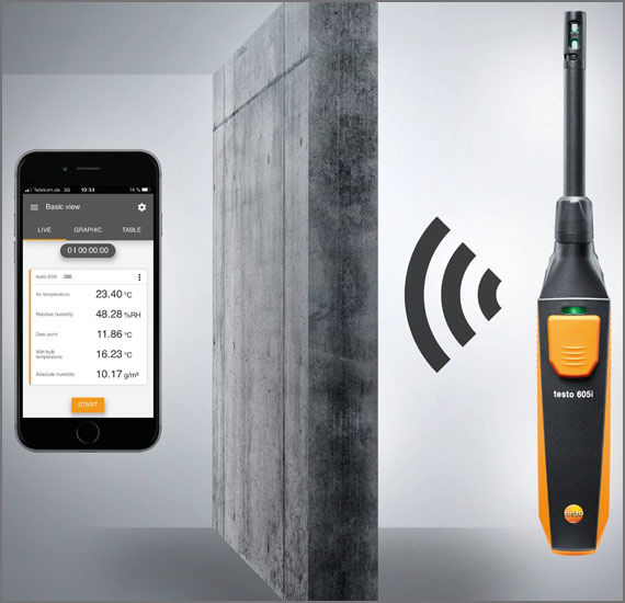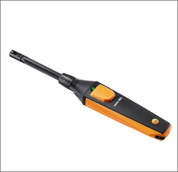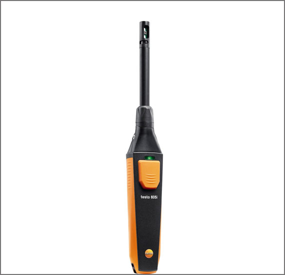 The compact testo 605i temperature and humidity measuring instrument with bendable probe head features professional measuring technology in an intelligent format: it can be used in conjunction with a smartphone/tablet and the testo Smart App to reliably measure air temperature and humidity in rooms and ducts.